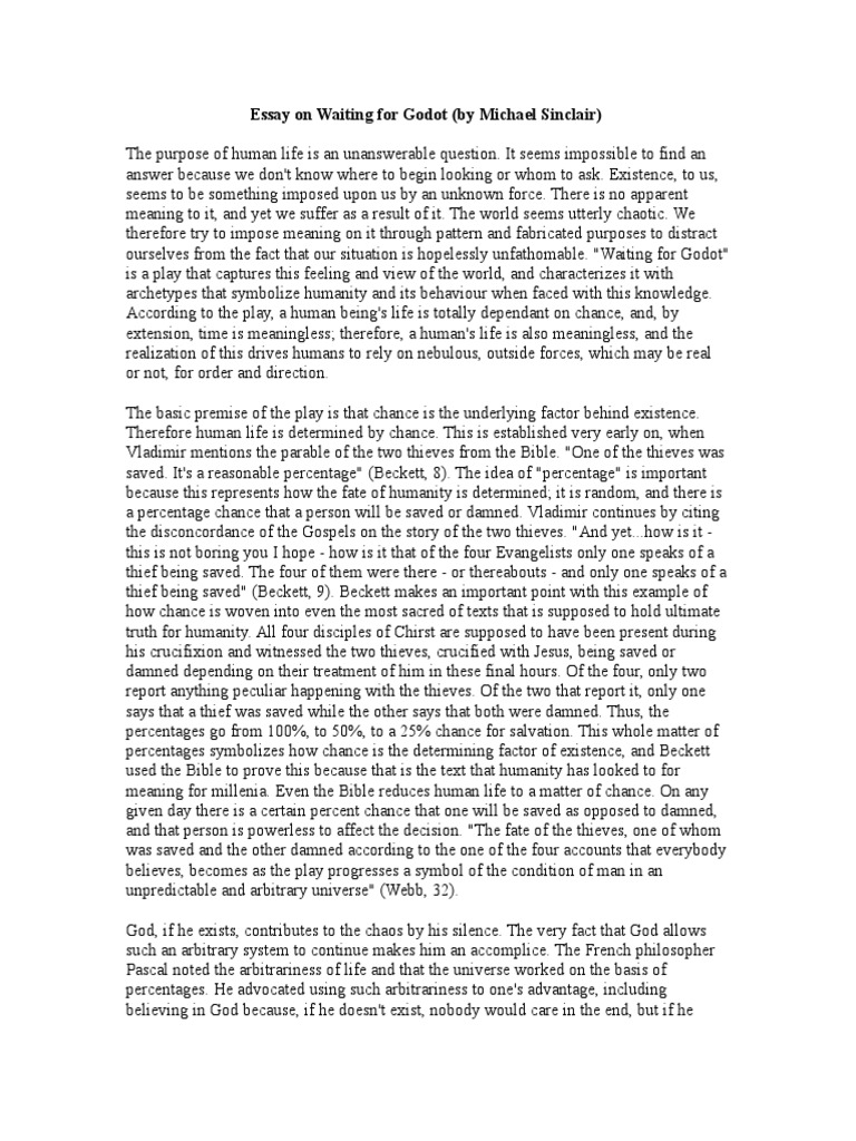 Waiting for Godot: Suggested Essay Topics | SparkNotes Waiting for Godot The two most important sets of characters in the play occur in pairs. Does this emphasis on pairs create some significance for the boy, who appears alone? Vladimir and the boy discuss his brother; could this brother be the boy's pair? 17/08/ · August 17, by Essay Writer. The theatre is always about the play, the characters and the drama. The three questions that the theatre asks are: what the play is, why it is the way it is and what the characters learn during the play? The play “Waiting for Godot” is about two people who are waiting for a person named Godot 03/01/ · Waiting For Godot Essays Example. Type of paper: Essay. Topic: Life, Correlation, Christians, Relationships, Slavery, Expectations, Power, Sense. Pages: 2. Words: Published: 01/03/ ORDER PAPER LIKE THIS. Waiting for Godot was written precisely after the World War II, and it is a commonplace to link the Theatre of the Absurd with